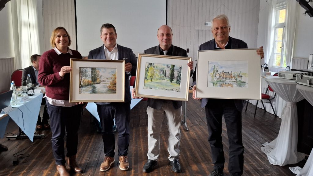 Es ist schon eine Zeit her, dass diese drei Bilder aus einem Nachlass an die IPA Köln übergeben wurden. Sie alle zeigen das IBZ Schloss Gimborn und somit war vereinbartes Ziel, dass sie dorthin übergeben werden. Klar war aber auch, dass dies einen passenden Rahmen braucht. Dieser ergab sich am 08.11.2025 im Rahmen der Mitgliederversammlung des IBZ. Unsere Kölner Verbindungsstellenleiterin Silke Paul übergab die Bilder dort an René Kauffmann (Direktor IBZ Schloss Gimborn), Peter Newels (Vorsitzender Trägerverein IBZ Schloss Gimborn) und Jürgen Mathies (Vorsitzender Kuratorium).
