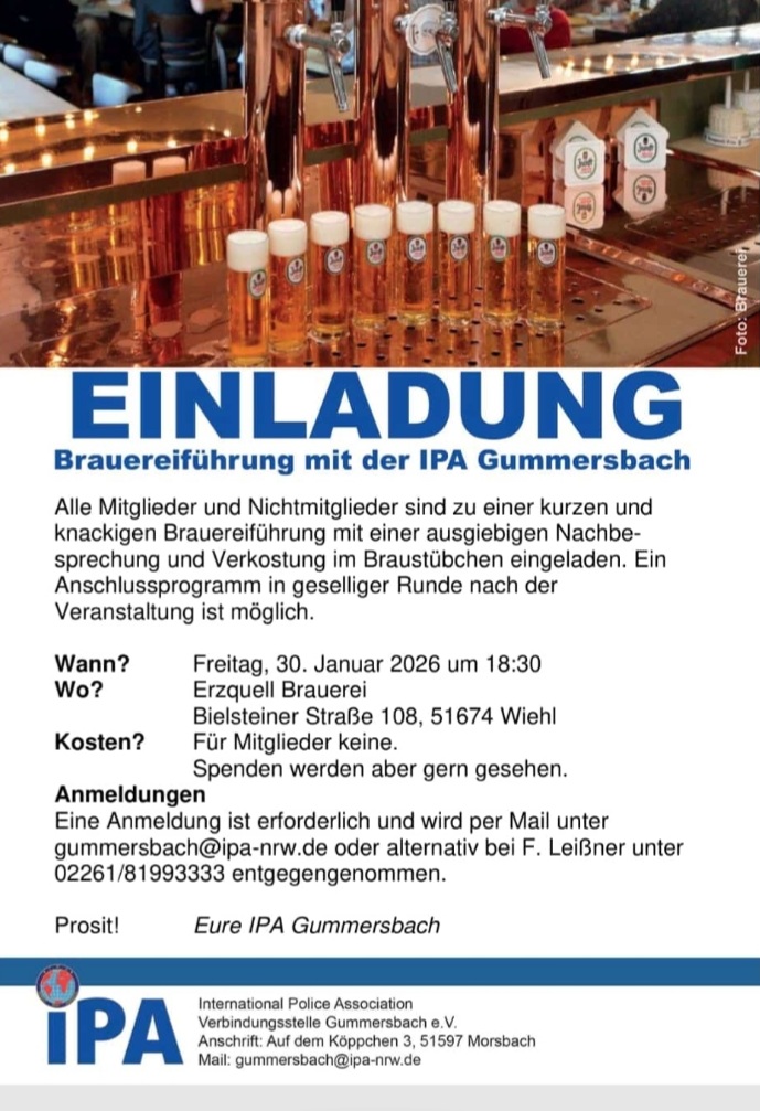 Die IPA Gummersbach hat die Besichtigung der Erzquell-Brauerei organisiert. Weitere Infos können dem Flyer entnommen werden.